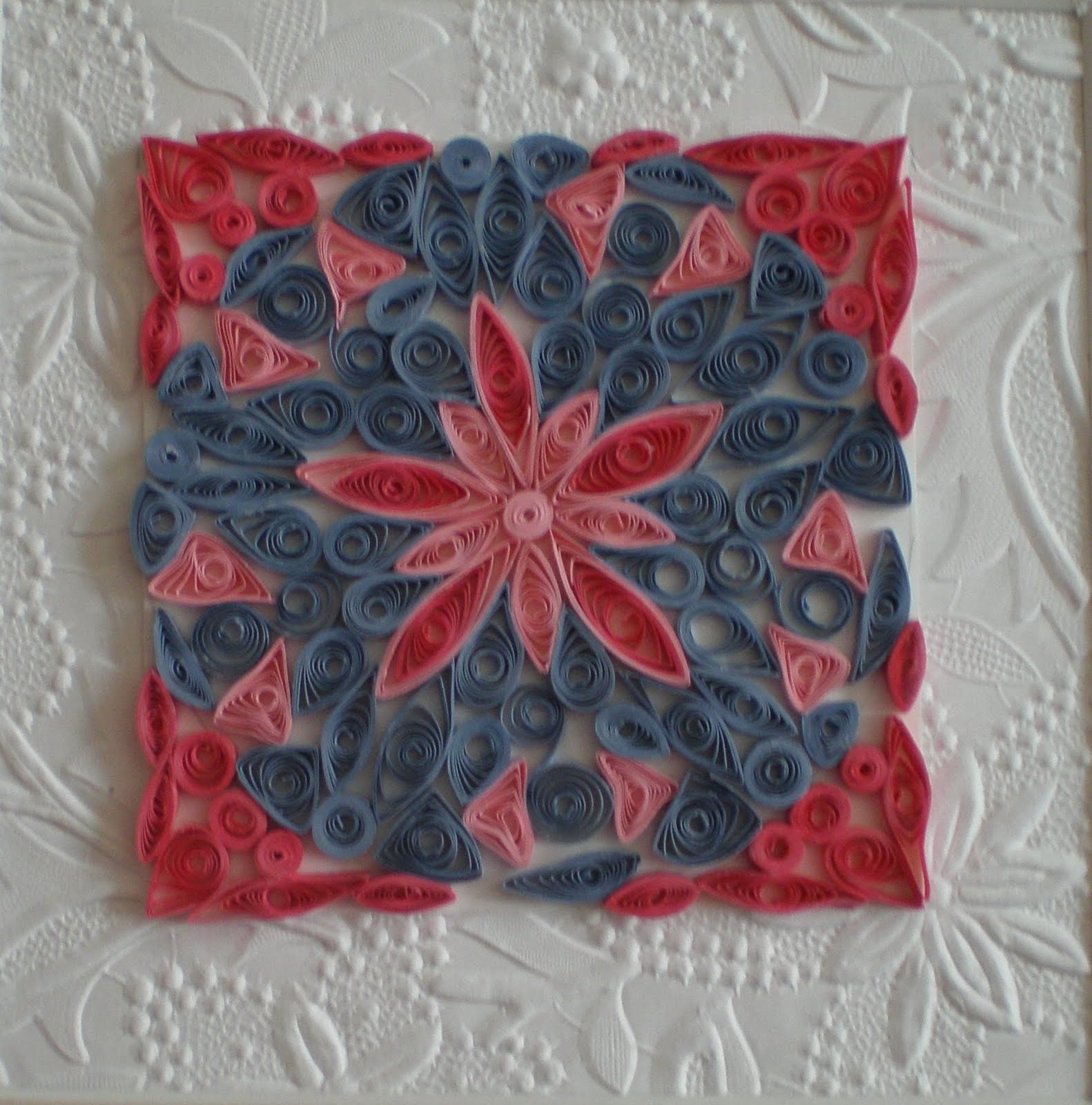 So, I've decided that not having a ventilated workspace is not going to stop me from making art that I enjoy. That used to mean making oil paintings and it still would if I had the ventilation, but since I became aware of paper quilling last year when I was asked to teach a workshop on the subject, I've continued to dabble with quilled paper designs. Mostly, I find myself drawn to designs with rotational symmetry and some floral influence. They are circles within squares (or diamonds, depending on how you orient them).The designs do feel like they have some relationship to my work in oils. The scale and size are about the same and they relate to the en-masse series in that they do have repeated shapes that are clustered together. For now, making them is proving satisfying in many ways. I like the look of them, the tactile quality, the verging on the edge of 2D and 3D design, and the way I can pick them up and put them down whenever I can squeeze in a few minutes of time. There is little cleanup or preparation and all the materials store easily in one portable box.